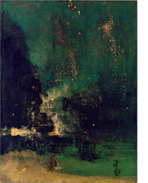 The painting which Ruskin particularly had in mind was usually been called ‘The Falling Rocket’, though it was described in the gallery catalogue as ‘A Nocturne in Black and Gold’; it was inspired by a fireworks display in the Cremorne public gardens. [Reference: Montgomery Hyde, Their Good Names, Hamish Hamilton, 1970, p. 67]